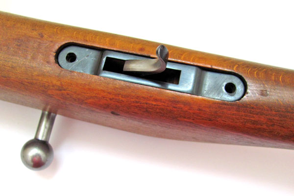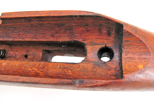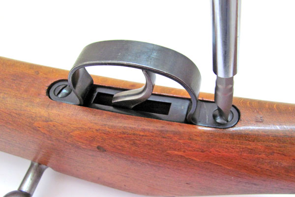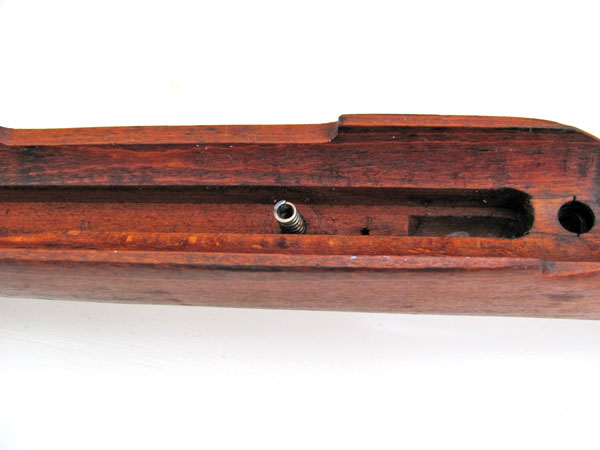 There's a spring in the stock under the sear. It has been suggested that one can lighten the trigger pull by removing this spring. I think that's a very bad idea because it makes the sear more likely to release if the rifle is bumped or dropped. The trigger is light enough anyway. |