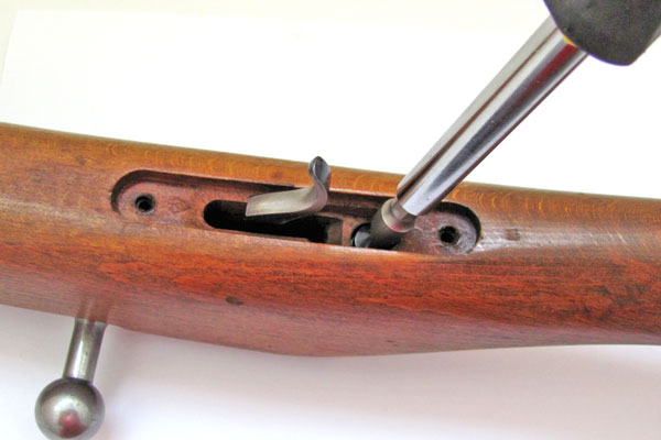 Remove both action screws and separate the action from the stock. Mind the little black washers under the action screws that they don't stick to the stock and then fall off and get lost. |