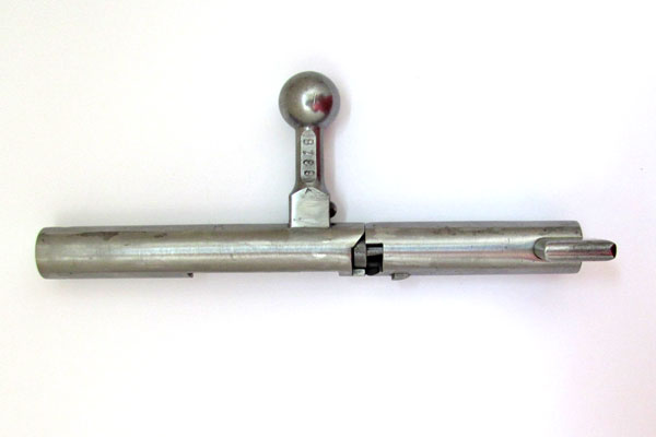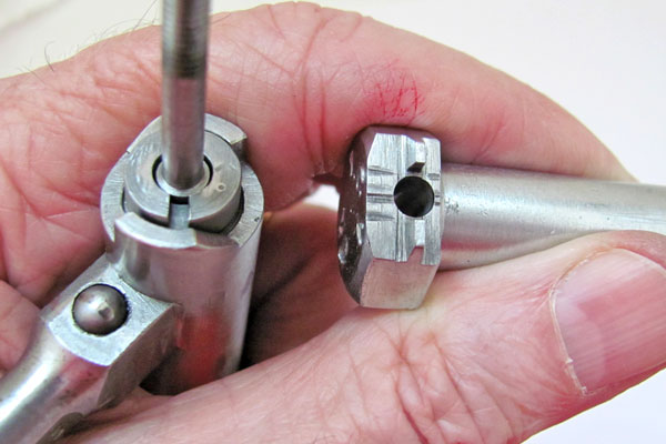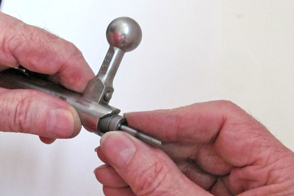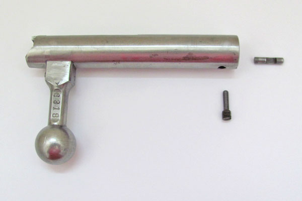 The firing pin is held in by a transverse partly-threaded pin which we remove with a screwdriver. |