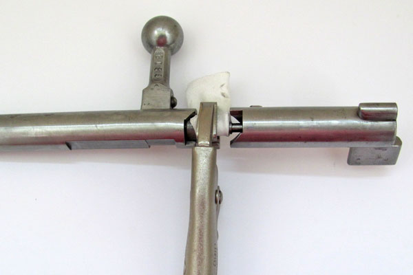 With the cocking piece off we see the slotted striker nut. If this nut works loose during use then you get light strikes, or no strike at all, and it has to be tightened. So it's best if it's moderately tight anyway. If it isn't tight then it can be unscrewed by putting a screwdriver into one of the slots, but if it's tight then that method damages the slot at best. |