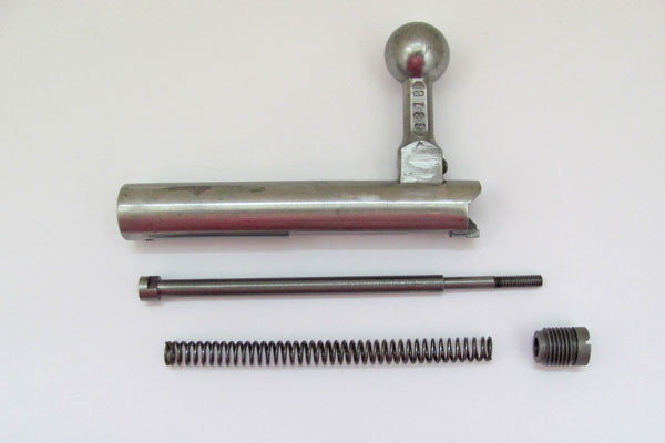 Here we see the bolt body, the striker shaft, the striker spring, and the striker nut. |