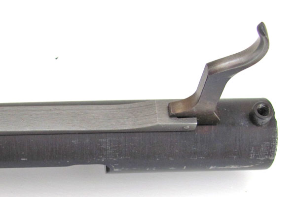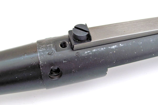 The sear is held in place by a large screw, which is locked in place by a retainer. We'd rather not bend the retainer, so we won't remove the sear. The retainer can't be bent very many times, and it would be unfortunate if it broke. We can see here how the barrel is pinned. That's a bit unusual. |