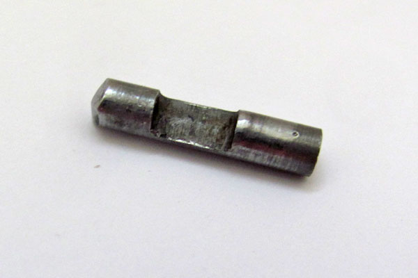 If we're lucky, the firing pin falls out either to the front or the rear. You can see here how it's notched so it will be retained by the transverse pin. In this case the rear end of the notch was peened from dry firing so much that the pin wouldn't move, and it had to be driven into the bolt with a punch; it then fell out the back of the bolt. |